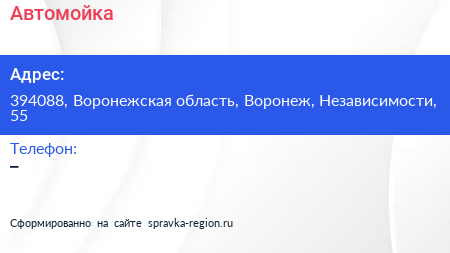 Автомойка по адресу 394088, Воронежская область, Воронеж, Независимости, 55 в дальнейшем Организация, размещена в следующих категориях: