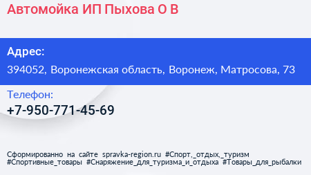 Автомойка, ИП Пыхова О.В. по адресу 394052, Воронежская область, Воронеж, Матросова, 73 в дальнейшем Организация, размещена в следующих категориях: