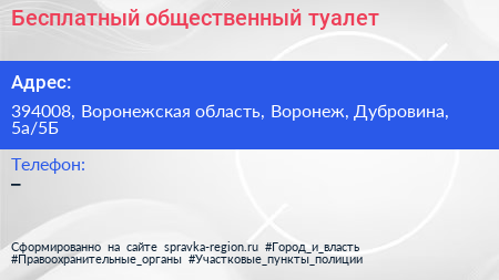 Бесплатный общественный туалет по адресу 394008, Воронежская область, Воронеж, Дубровина, 5а/5Б в дальнейшем Организация, размещена в следующих категориях: