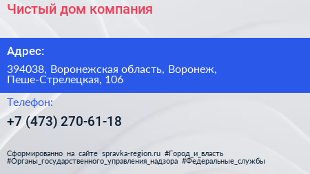 Чистый дом, компания по адресу 394038, Воронежская область, Воронеж, Пеше-Стрелецкая, 106 в дальнейшем Организация, размещена в следующих категориях: