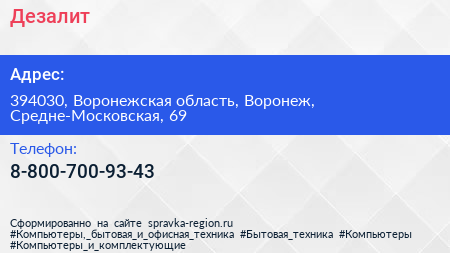 Дезалит по адресу 394030, Воронежская область, Воронеж, Средне-Московская, 69 в дальнейшем Организация, размещена в следующих категориях: