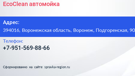 EcoClean, автомойка по адресу 394016, Воронежская область, Воронеж, Подгоренская, 90 в дальнейшем Организация, размещена в следующих категориях:
