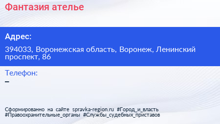 Фантазия, ателье по адресу 394033, Воронежская область, Воронеж, Ленинский проспект, 86 в дальнейшем Организация, размещена в следующих категориях:
