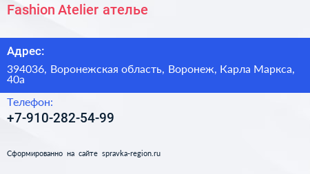 Fashion Atelier, ателье по адресу 394036, Воронежская область, Воронеж, Карла Маркса, 40а в дальнейшем Организация, размещена в следующих категориях: