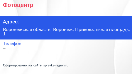 Фотоцентр по адресу Воронежская область, Воронеж, Привокзальная площадь, 1 в дальнейшем Организация, размещена в следующих категориях:
