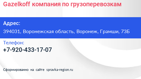 Gazelkoff, компания по грузоперевозкам по адресу 394031, Воронежская область, Воронеж, Грамши, 73Б в дальнейшем Организация, размещена в следующих категориях: