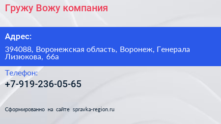 Гружу-Вожу, компания по адресу 394088, Воронежская область, Воронеж, Генерала Лизюкова, 66а в дальнейшем Организация, размещена в следующих категориях: