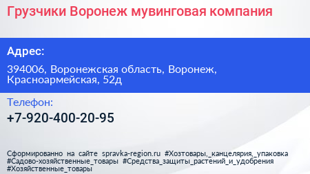 Грузчики Воронеж, мувинговая компания по адресу 394006, Воронежская область, Воронеж, Красноармейская, 52д в дальнейшем Организация, размещена в следующих категориях: