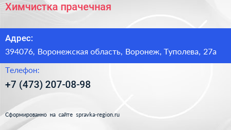Химчистка-прачечная по адресу 394076, Воронежская область, Воронеж, Туполева, 27а в дальнейшем Организация, размещена в следующих категориях: