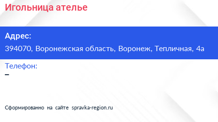 Игольница, ателье по адресу 394070, Воронежская область, Воронеж, Тепличная, 4а в дальнейшем Организация, размещена в следующих категориях:
