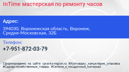 InTime, мастерская по ремонту часов по адресу 394030, Воронежская область, Воронеж, Средне-Московская, 32Б в дальнейшем Организация, размещена в следующих категориях: