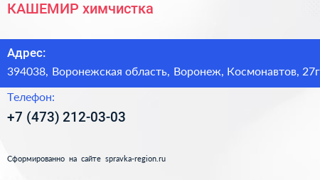 КАШЕМИР, химчистка по адресу 394038, Воронежская область, Воронеж, Космонавтов, 27г в дальнейшем Организация, размещена в следующих категориях:
