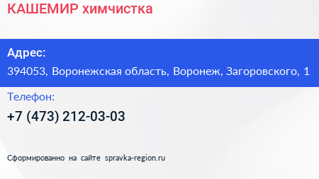 КАШЕМИР, химчистка по адресу 394053, Воронежская область, Воронеж, Загоровского, 1 в дальнейшем Организация, размещена в следующих категориях: