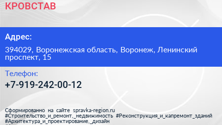 КРОВСТАВ по адресу 394029, Воронежская область, Воронеж, Ленинский проспект, 15 в дальнейшем Организация, размещена в следующих категориях: