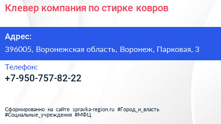 Клевер, компания по стирке ковров по адресу 396005, Воронежская область, Воронеж, Парковая, 3 в дальнейшем Организация, размещена в следующих категориях: