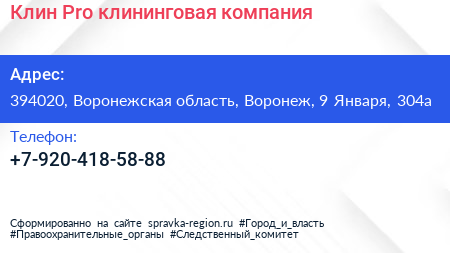 Клин Pro, клининговая компания по адресу 394020, Воронежская область, Воронеж, 9 Января, 304а в дальнейшем Организация, размещена в следующих категориях: