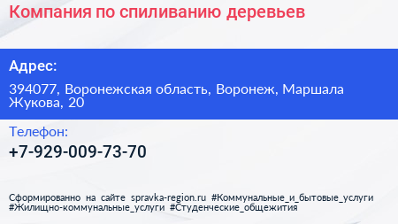 Компания по спиливанию деревьев по адресу 394077, Воронежская область, Воронеж, Маршала Жукова, 20 в дальнейшем Организация, размещена в следующих категориях: