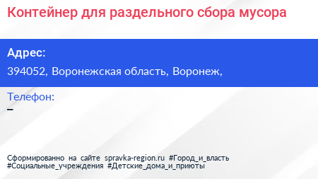 Контейнер для раздельного сбора мусора по адресу 394052, Воронежская область, Воронеж, в дальнейшем Организация, размещена в следующих категориях: