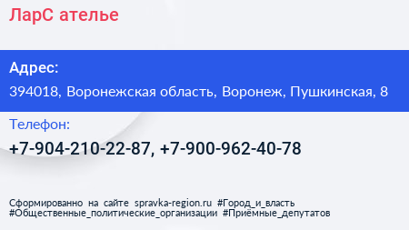ЛарС, ателье по адресу 394018, Воронежская область, Воронеж, Пушкинская, 8 в дальнейшем Организация, размещена в следующих категориях: