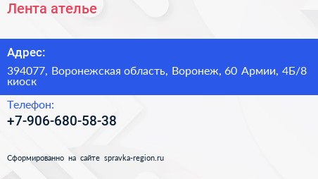 Лента, ателье по адресу 394077, Воронежская область, Воронеж, 60 Армии, 4Б/8 киоск в дальнейшем Организация, размещена в следующих категориях: