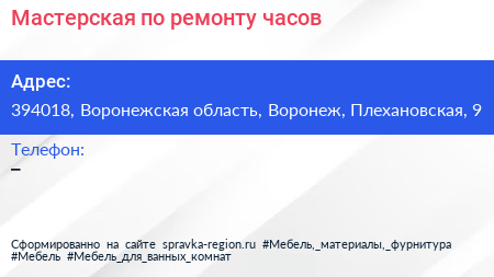 Мастерская по ремонту часов по адресу 394018, Воронежская область, Воронеж, Плехановская, 9 в дальнейшем Организация, размещена в следующих категориях: