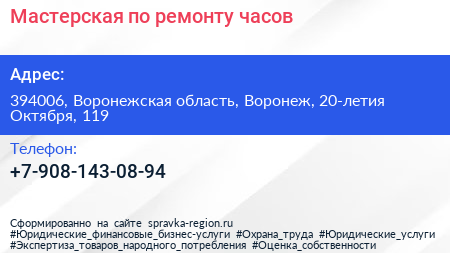 Мастерская по ремонту часов по адресу 394006, Воронежская область, Воронеж, 20-летия Октября, 119 в дальнейшем Организация, размещена в следующих категориях: