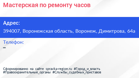 Мастерская по ремонту часов по адресу 394007, Воронежская область, Воронеж, Димитрова, 64а в дальнейшем Организация, размещена в следующих категориях: