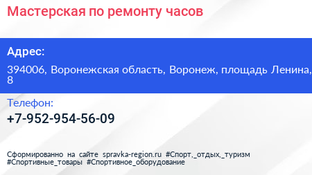 Мастерская по ремонту часов по адресу 394006, Воронежская область, Воронеж, площадь Ленина, 8 в дальнейшем Организация, размещена в следующих категориях: