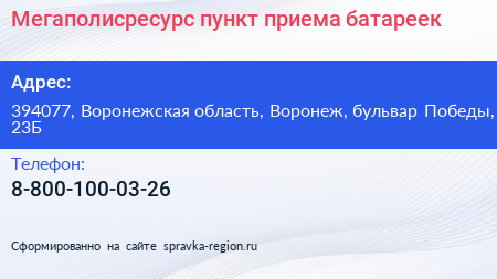 Мегаполисресурс, пункт приема батареек по адресу 394077, Воронежская область, Воронеж, бульвар Победы, 23Б в дальнейшем Организация, размещена в следующих категориях: