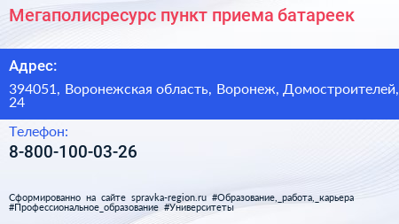 Мегаполисресурс, пункт приема батареек по адресу 394051, Воронежская область, Воронеж, Домостроителей, 24 в дальнейшем Организация, размещена в следующих категориях: