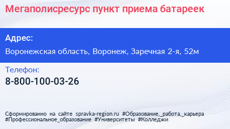 Мегаполисресурс, пункт приема батареек по адресу Воронежская область, Воронеж, Заречная 2-я, 52м в дальнейшем Организация, размещена в следующих категориях: