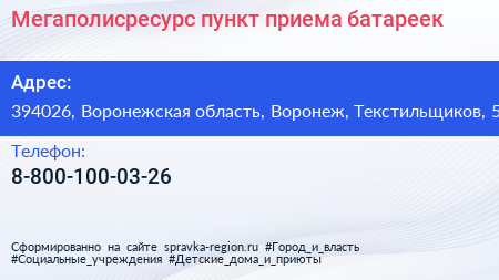 Мегаполисресурс, пункт приема батареек по адресу 394026, Воронежская область, Воронеж, Текстильщиков, 5 в дальнейшем Организация, размещена в следующих категориях:
