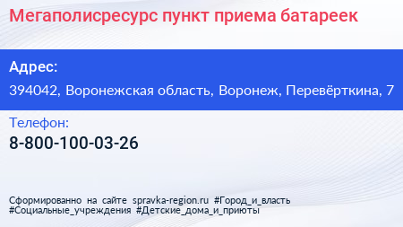 Мегаполисресурс, пункт приема батареек по адресу 394042, Воронежская область, Воронеж, Перевёрткина, 7 в дальнейшем Организация, размещена в следующих категориях: