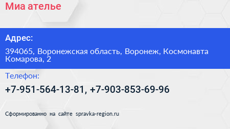 Миа, ателье по адресу 394065, Воронежская область, Воронеж, Космонавта Комарова, 2 в дальнейшем Организация, размещена в следующих категориях: