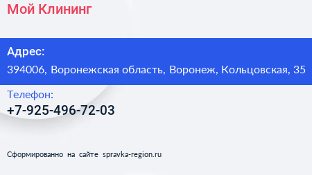 Мой Клининг по адресу 394006, Воронежская область, Воронеж, Кольцовская, 35 в дальнейшем Организация, размещена в следующих категориях: