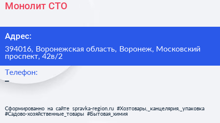 Монолит, СТО по адресу 394016, Воронежская область, Воронеж, Московский проспект, 42в/2 в дальнейшем Организация, размещена в следующих категориях: