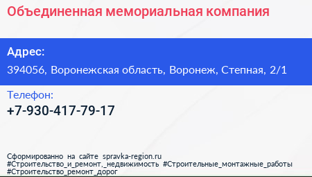 Объединенная мемориальная компания по адресу 394056, Воронежская область, Воронеж, Степная, 2/1 в дальнейшем Организация, размещена в следующих категориях: