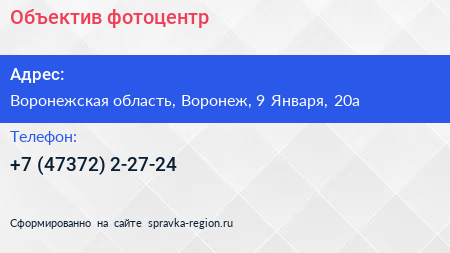 Объектив, фотоцентр по адресу Воронежская область, Воронеж, 9 Января, 20а в дальнейшем Организация, размещена в следующих категориях:
