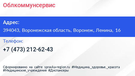 Облкоммунсервис по адресу 394043, Воронежская область, Воронеж, Ленина, 16 в дальнейшем Организация, размещена в следующих категориях: