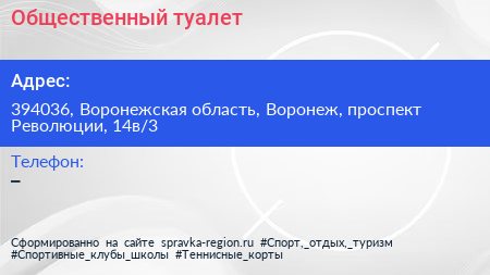 Общественный туалет по адресу 394036, Воронежская область, Воронеж, проспект Революции, 14в/3 в дальнейшем Организация, размещена в следующих категориях: