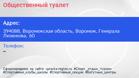 Общественный туалет по адресу 394088, Воронежская область, Воронеж, Генерала Лизюкова, 60 в дальнейшем Организация, размещена в следующих категориях: