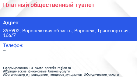 Платный общественный туалет по адресу 396902, Воронежская область, Воронеж, Транспортная, 16а/7 в дальнейшем Организация, размещена в следующих категориях: