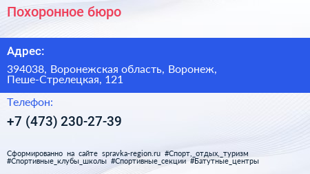 Похоронное бюро по адресу 394038, Воронежская область, Воронеж, Пеше-Стрелецкая, 121 в дальнейшем Организация, размещена в следующих категориях:
