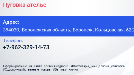 Пуговка, ателье по адресу 394030, Воронежская область, Воронеж, Кольцовская, 62Б в дальнейшем Организация, размещена в следующих категориях: