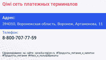 Qiwi, сеть платежных терминалов по адресу 394010, Воронежская область, Воронеж, Артамонова, 11 в дальнейшем Организация, размещена в следующих категориях: