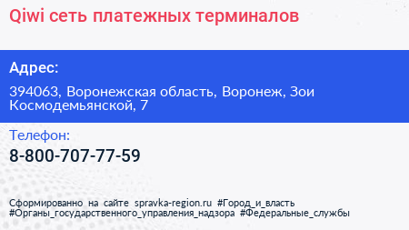 Qiwi, сеть платежных терминалов по адресу 394063, Воронежская область, Воронеж, Зои Космодемьянской, 7 в дальнейшем Организация, размещена в следующих категориях: