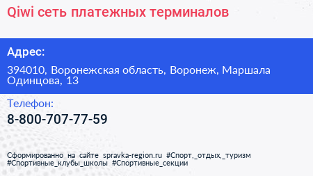 Qiwi, сеть платежных терминалов по адресу 394010, Воронежская область, Воронеж, Маршала Одинцова, 13 в дальнейшем Организация, размещена в следующих категориях:
