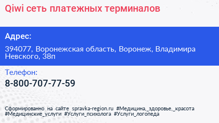 Qiwi, сеть платежных терминалов по адресу 394077, Воронежская область, Воронеж, Владимира Невского, 38п в дальнейшем Организация, размещена в следующих категориях: