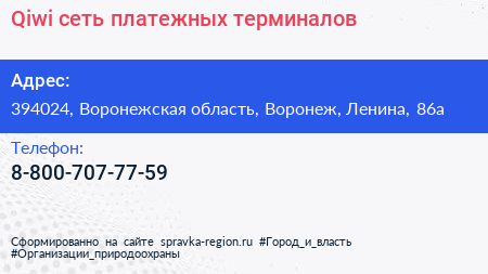 Qiwi, сеть платежных терминалов по адресу 394024, Воронежская область, Воронеж, Ленина, 86а в дальнейшем Организация, размещена в следующих категориях: