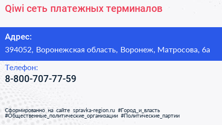 Qiwi, сеть платежных терминалов по адресу 394052, Воронежская область, Воронеж, Матросова, 6а в дальнейшем Организация, размещена в следующих категориях: